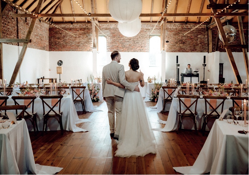 Ein besonderes Highlight, das Hochzeitsplanerin Katharina Gronwald ihren Paaren bietet, ist der sognannte First Look des Raumes. Der festlich dekorierte Dinnerraum bleibt bis zum Einlass für Paar und Gäste verschlossen und nicht einsehbar. Erst wenn alles perfekt vorbereitet und die Kerzen entzündet sind, darf das Paar den Raum als erstes – und zunächst allein – betreten und sieht die gemeinsam geplante Dekoration das erste Mal in voller Pracht. Dieser Moment ist nicht nur emotional, sondern auch eine kleine Zeitinsel für das Brautpaar. Während der Hochzeit sind sie meist mitten im Geschehen – hier konnten Azime und Jens für einen Augenblick innehalten und ganz bewusst realisieren, dass ihr großer Tag nun Wirklichkeit geworden war. DJ Tom Jansen wählte für diesen Moment mit viel Fingerspitzengefühl einen Song mit besonderer Bedeutung. Fotograf Dennis Brandt hielt diese Minuten unauffällig fest.