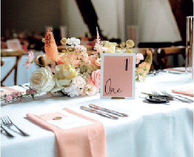 'Das Design der Hochzeit sollte bewusst im Kontrast zur Location stehen: clean, aber blumig. Das Farbkonzept setzte auf Weiß sowie zarte Apricot- und Blushtöne. Die rustikalen Holztische wurden mit weißen Leinentischdecken eingedeckt und mit üppigen Blumengestecken der Blumenbinderei, Kerzen in Glashaltern sowie der wunderschönen Papeterie von Jubelzeiten dekoriert. Eine besondere Rolle spielte die Zweisprachigkeit: Da sowohl deutsche als auch türkische Gäste erwartet wurden, waren Willkommensschild, Sitzplan und Menükarten auf Deutsch und Türkisch gestaltet.